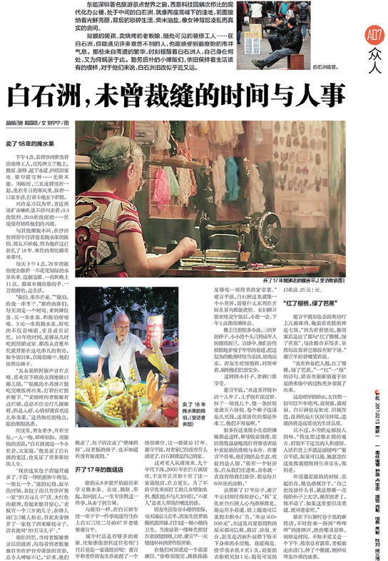 晶报新一轮改版,在故事采写上下了功夫。新闻选题,注重深耕本土,关注有深圳印记、生活化的普通人的故事和命运;新闻采写,强调通过可感的人物故事,从小切口切入社会大话题,举重若轻地在新闻的深度上下功夫,春风化雨般呈现新闻的价值;新闻文本,强调非虚构的叙事手法,通过细腻的笔触勾出故事线,从而增强文章的可读性。